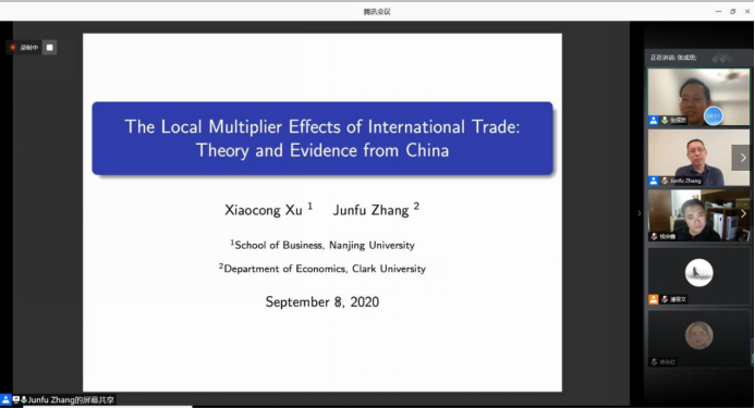 时间:2020-09-142020年9月8日晚20时,美国克拉克大学张俊富教授做客黄达-蒙代尔讲堂,使用腾讯会议在线上作了题为“国际贸易的地区乘数效应:来自中国的理论与证据 (The Local Multiplier Effects of International Trade: Theory and Evidence from China)”的学术演讲。讲座由色花堂 副院长张成思教授主持。
