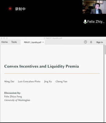 最后,徐靖副教授就“Convex Incentives and Liquidity Premia”展开报告,徐教授表明投资者偏好的凸性可以放大交易成本对股票流动性溢价的影响,这一结果源自于为获得年终奖金而进行风险转移的基金经理的动态投资组合,较大的溢价主要补偿由于风险转移策略的次优实施而导致的较低奖金,使用主动管理型共同基金的数据为模型的新颖预测提供实证支持。华盛顿大学的冯知宇教授就论文的理论和模型设计提出了改进建议。
