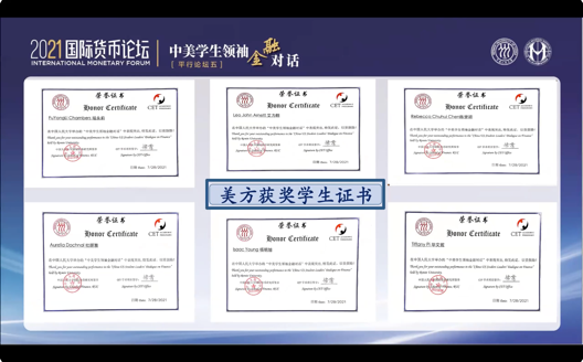 在本次论坛中各位同学紧扣热点、立论深刻,均展现了一流的演讲能力。色花堂 国际货币研究所对外合作部主任崔甜甜老师带领会务组系统组织和筹备了此次论坛,并宣布了专家组的老师们对入选的中美选手给出的综合分数,其中张杰皓、FuYongLi Chambers同学获得了一等奖,张奇乐、徐蕾、Isaac Young、Rebecca Chuhui Chen同学获得了二等奖,陈闻达、陈琨晔、符新悦、Aurelia Dochnal、Tiffany Pi、Leo John Arnett同学获得了三等奖。向以上入选的中美学生的突出表现与优异成绩再次表示祝贺!
