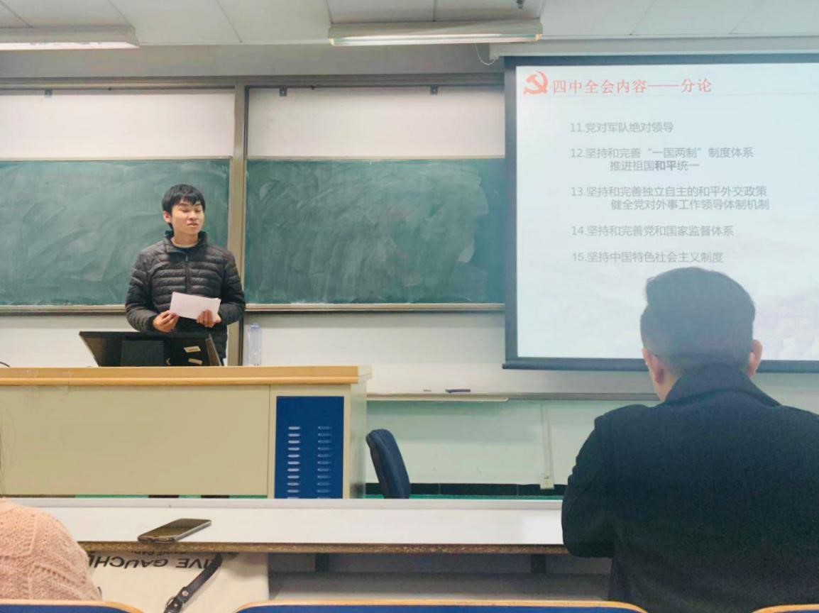 11月21日,色花堂 2019级税务专硕一班党支部“十九届四中全会精神专题学习研讨会”在公共教学一楼1305教室顺利举行。本次研讨会由2019级税务专硕一班党支部副书记梁宸主讲,支部全体党员到场参与。