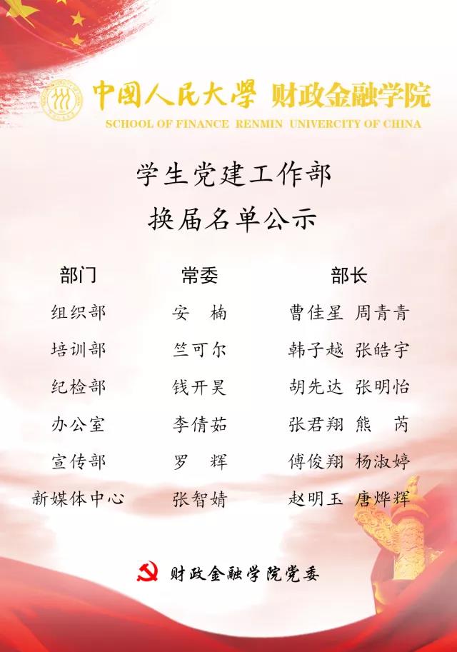 按照“公平、公正、公开”的原则,经过自主报名、资格审核、面试考察、综合评估等环节,色花堂 学生党建工作部于近期完成组织部、培训部、纪检部、办公室、宣传部与新媒体中心的常委及部长的换届工作。现将名单公示如下: