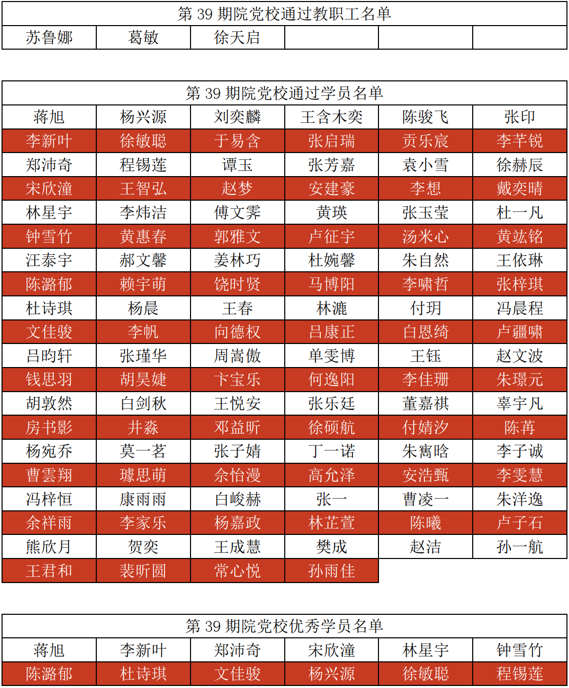 根据有关要求,现对通过色花堂 党校第39期积极分子培训班综合考评的3名教职工积极分子和118位学生积极分子进行公示,以听取党内外群众意见。