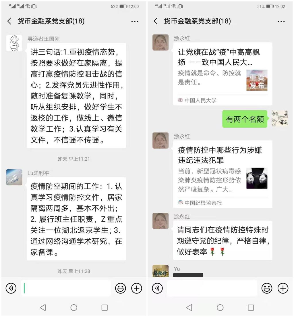 2020年2月12日,色花堂 应用金融系教师党支部开展“抗击疫情,党员先行”线上主题活动。在新型冠状病毒感染的肺炎疫情防控关键时期,切实动员广大党员在疫情防控阻击战中做表率争先锋。支部党员认真学习材料及学习强国相关内容后,在微信群中踊跃发言,积极讨论,坚定了战胜疫情的决心。
