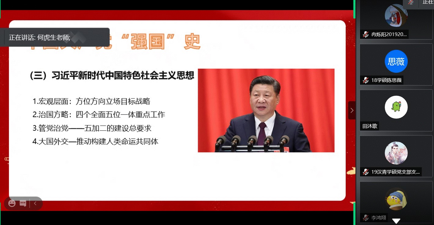 何虎生教授以“救国·兴国·富国·强国”为主题进行党史专题讲座,重点讲述中国共产党百年奋斗历史和基本经验。他首先阐述了“为什么要学习党史” “党史学习主要学什么”“怎样学习党史”几个基本问题。何虎生教授表示,学习党史是为了明理、增信、崇德、力行;党史学习应当重点掌握三个思维:纵向思维、横向思维和人物思维;学习党史应当以总书记关于党史的重要论述为指导,在树立正确党史观的基础上正确理解解读学习。