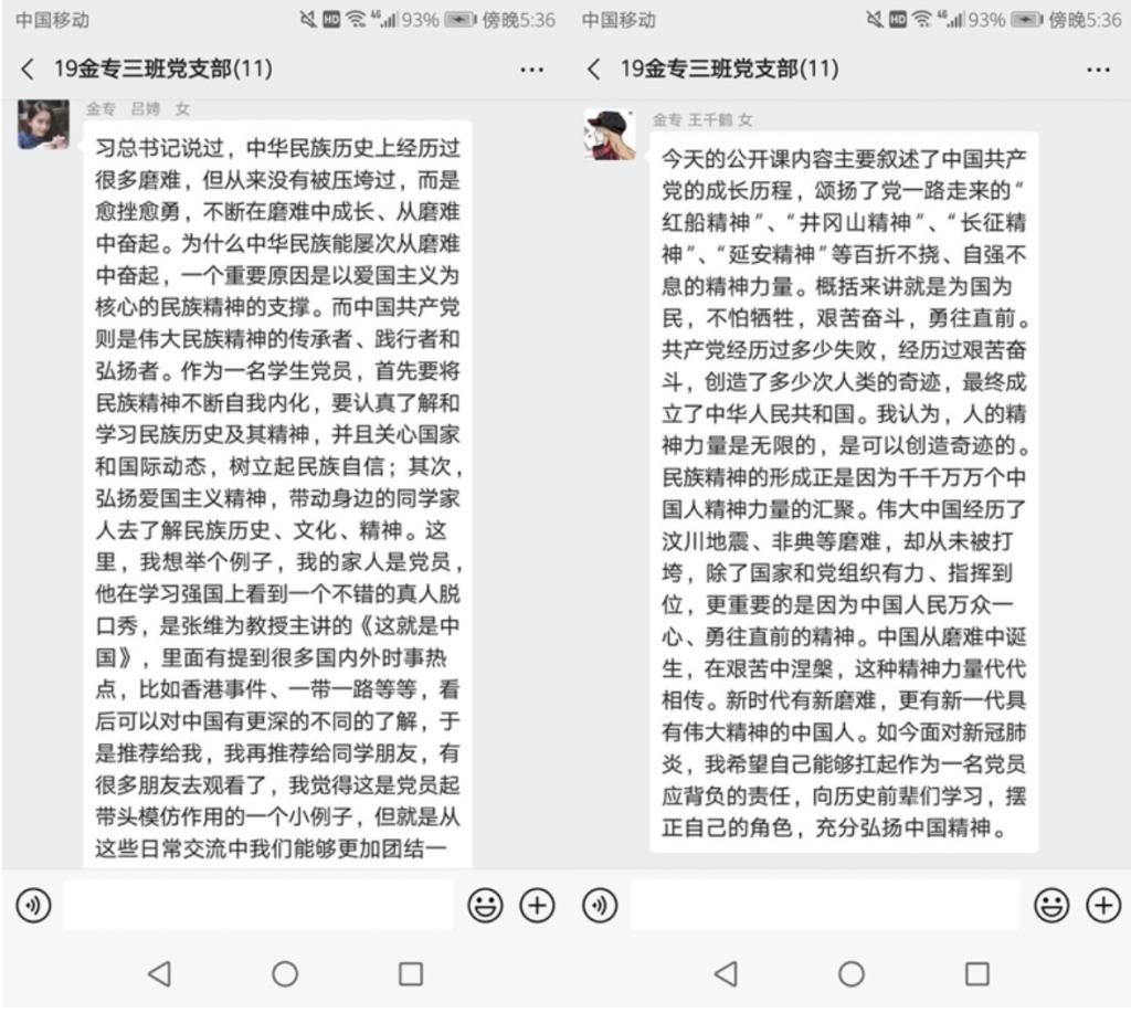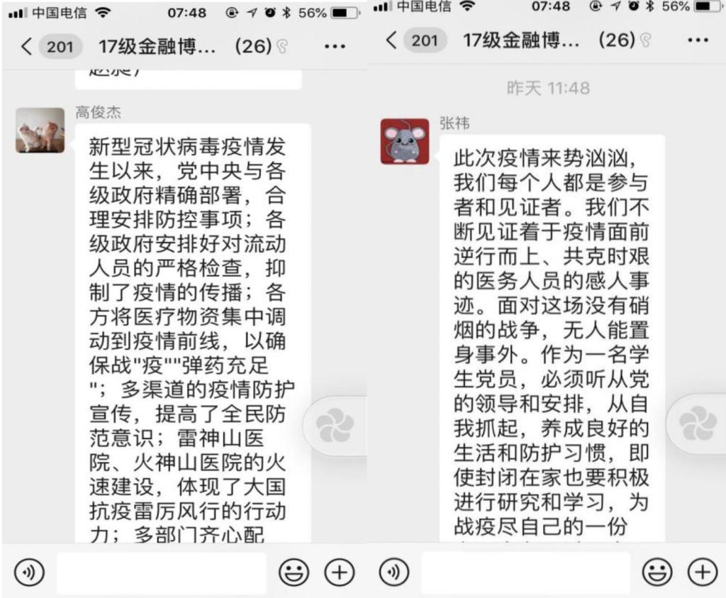 3月13日,2017级金融博士党支部开展了“画好抗击疫情的同心圆”线上主题党日活动,全体党员就如何发挥党员的模范带头作用和支部的战斗堡垒作用通过线上文字形式分享了自己的感想。大家一致认为,在疫情发生后国家全体党员迅速投入到了疫情防控工作中,万众一心、齐心协力,用坚强党性筑起了抗击疫情的“中流砥柱”,我们国家一定可以打赢此次疫情攻坚战。