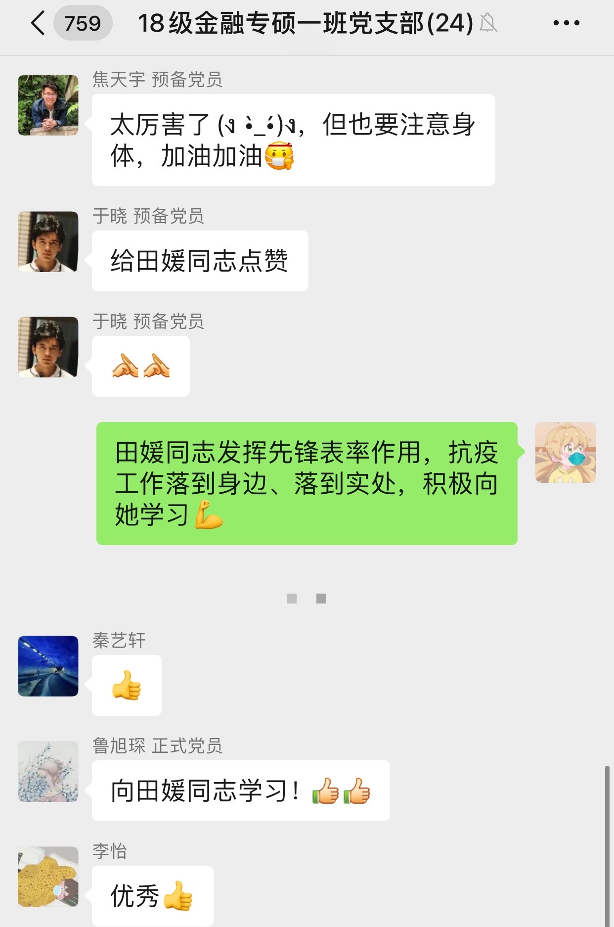 3月12日,2018级金融专硕一班党支部在线上开展了“画好抗击疫情的同心圆” 主题党日活动。活动中,身处疫区的田媛同志分享了她的“战疫日记”。疫情期间,她主动参与社区物资配送,每天的工作量和工作强度都很大,常常忍受着腰酸背痛搬运每袋重达50斤的大米。连续一个月忙到凌晨四点才回家,5点半睡觉11点半起床成了她的“正常作息”;中午到下午抽空完成实习工作,吃完晚饭就又赶去帮忙配送物资......长时间的熬夜使她严重睡眠不足,但即便疲惫万分,她仍然坚持参与志愿工作,保障了社区居民生活物资的及时供应,广受好评。支部成员纷纷为其点赞,表态要向她看齐,在未来进一步履行作为一名共产党员的职责,身体力行加入到抗疫之中。
