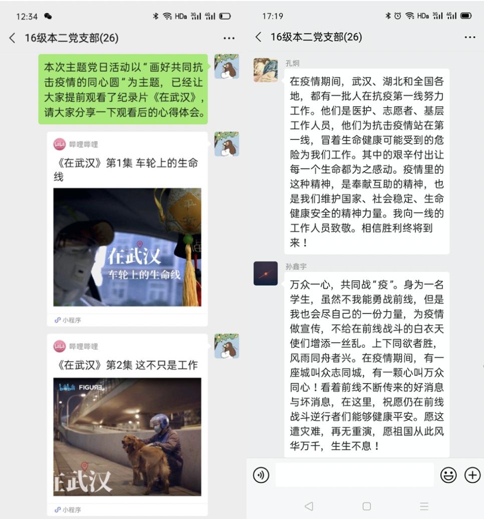 主题党日期间,多个学生党支部借助学习强国平台,在线学习“在经历中学习——疫情防控公开课”,并分享学习心得;2016级本科第三党支部等组织观看《在武汉》抗击疫情纪录片,向一线志愿者和医护人员致敬。