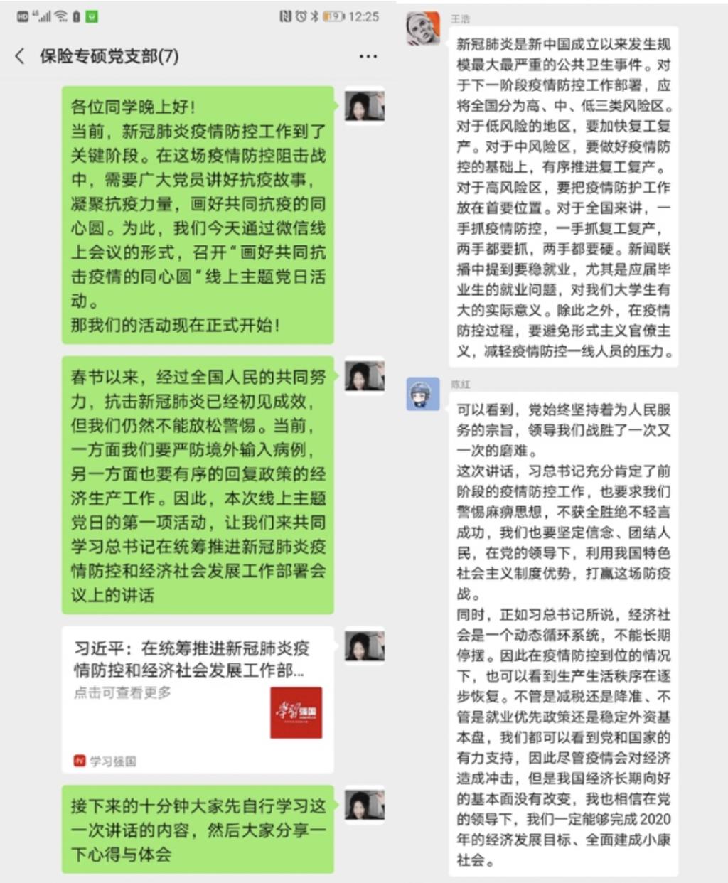 保险系教师党支部于2020年3月10日晚组织开展“画好抗击疫情的同心圆”线上主题党日活动。党员教师通过阅读新华社通稿,及时学习习近平总书记讲话精神并交流学习体会,对战胜疫情充满信心。同时,支部成员还结合疫情发生过程中暴露出的部分地区教学资源匮乏、远程教学困难等问题,讨论策划停课不停学系列公益课程。通过本次主题党日,支部成员们统一思想,坚定抗击疫情的信心,在坚守岗位作好本职工作的同时,也力争为疫情防控贡献自己的专业智慧。