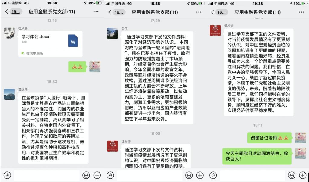 3月13日,应用金融系教师党支部开展“画好抗疫的同心圆”线上集体讨论。在新冠肺炎疫情防控工作的关键阶段,支部党员结合自己的专业研究方向讲述抗疫故事。通过线上学习讨论,党支部各位成员加深了对当前疫情发展情况的了解,对当前国内经济形势有了更深刻的认识,进一步坚定了战“疫”信心,凝聚抗疫力量,画好共同抗击疫情的同心圆。