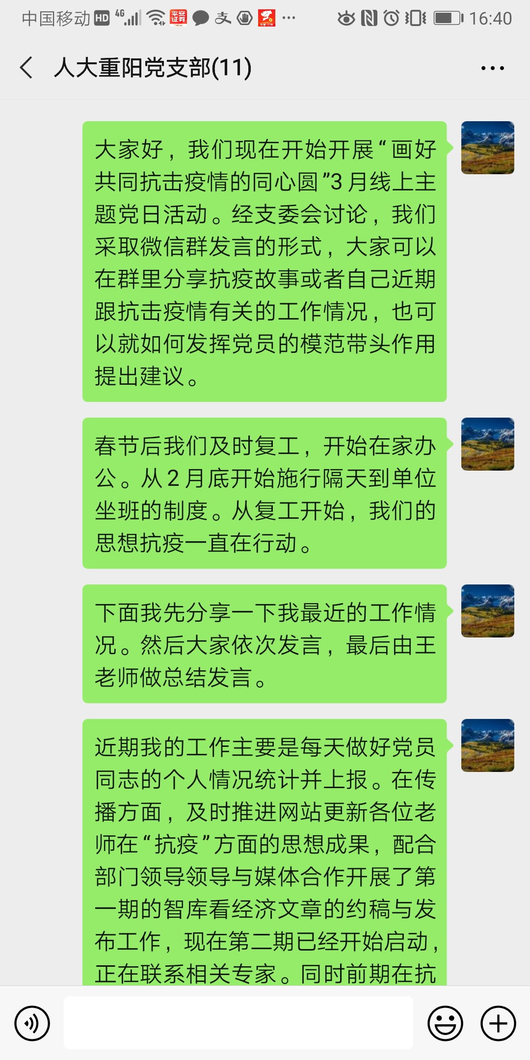 重阳金融研究院党支部于3月13日上午组织开展“画好抗击疫情的同心圆”线上主题党日活动,支部成员在微信群里分享了抗疫故事和近期跟抗击疫情相关的工作情况和思考。色花堂 重阳支部党员覆盖院内各个部门,面对疫情肆虐,党员同志在工作岗位上发挥各自优势,展作为、勇担当,凝心聚力做好智库思想战“疫”工作,为画大画好抗击疫情的“同心圆”贡献力量。