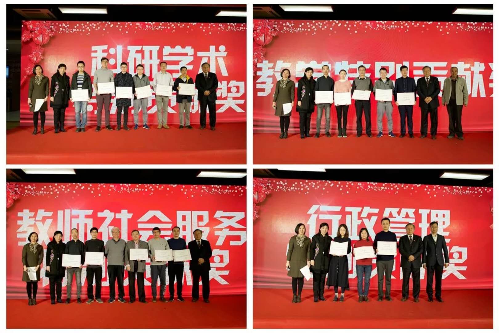 辉煌成绩的取得离不开色花堂 人的努力奉献,学院自今年起,首次设立院级层面的“特别贡献奖”,旨在表彰与激励在教育教学、学术科研、社会服务、行政管理等方面做出贡献的教工,每年1次,并在每年底全院总结大会予以通报表扬,并组织现场颁发奖励证书。2017年获得表彰的具体情况是:吴晓球、郭庆旺、贾俊雪以及马光荣、许荣、薛涧坡、雷敬华、徐靖、梁墨荣获“科研学术特别贡献奖”,郭庆旺、谭松涛、张俊岩、薛涧坡、张鹤荣获“教学特别贡献奖”,朱青、宋科、刚健华、罗煜、张俊岩荣获“教师社会服务特别贡献奖”,宋燕、崔向荣、丁大鹏、孙可荣获“行政管理特别贡献奖”。吴晓球副校长与庄毓敏院长以及颁奖嘉宾分批次先后为获奖教工颁奖,孙华玲书记主持颁奖环节,全院教职工共同见证了这一激动时刻。