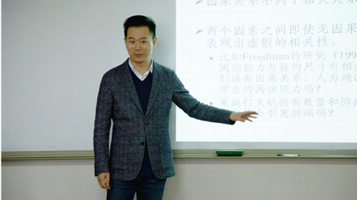 代志新老师的讲授主题为“随机实地实验”。代老师以“阅读能力与鞋码大小”和“肺癌发病率与打火机持有数”两组非因果关系数据给人的误导为背景,结合萨缪尔森“经济学不能实验,只能观察”的观点,介绍了实地实验对经济学理论研究的重要作用。他以生物学中单一变量实验类比节能宣传对家庭消费的影响实验,具体地讲述了实地实验的原理和基本步骤。