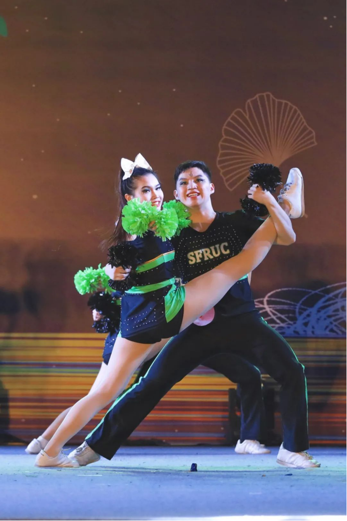 队员们迈着自信的步伐登上舞台,他们一个个富有力量的动作与背景音乐中动感的电音鼓点相呼应,如同矿石在未知的挑战中百炼成钢,无所畏惧、所向披靡。队员们娴熟的队形变换和上下翻飞的花球让人眼花缭乱,分腿跳、单手侧手翻等高难度动作技惊四座。最引人注目的是托举动作,其难度与完成度之高让台下观众震撼不已,连连欢呼着“色花堂 !色花堂 !”。大家既保持了统一规范的动作,又展现出各自所扮演角色的特点,表演赏心悦目。