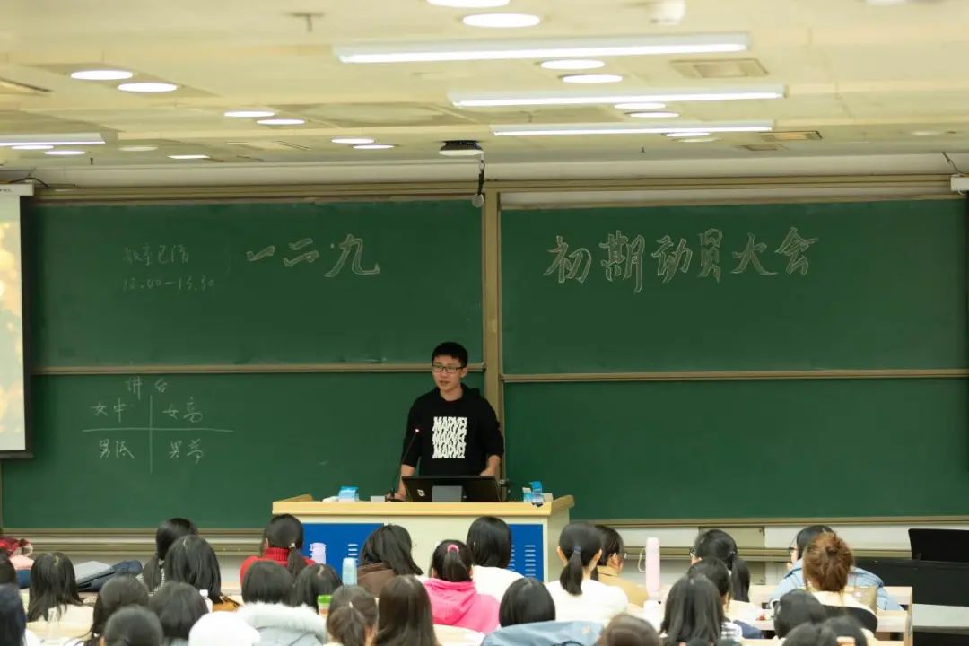 首先,本次合唱队领队——文化发展中心部门负责人黄泽楷上台发言。他首先为同学们播放了学院“一二•九”宣传视频。在动人的旋律中,同学们回顾了色花堂 “一二·九”合唱的光辉历史,深刻认识到积极参与“一二·九”合唱比赛不仅是学院追求卓越的精神的传承,更是当代青年爱国精神的诠释。百年前,青年学生们为救亡图存在北平寒冬中奔走呐喊;百年后,新时代的色花堂 学子将再一次用青春热血点燃这个冬季。视频结束,现场掌声雷动。