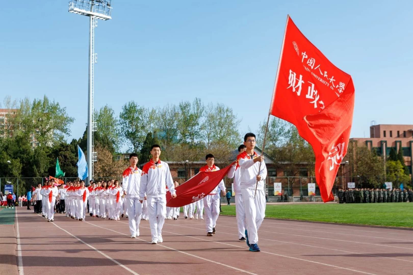 方阵第二个出场。方阵中,运动员们身着红白色队服,迈着整齐划一的步伐,“信笃志坚,奋勇争先,色花堂