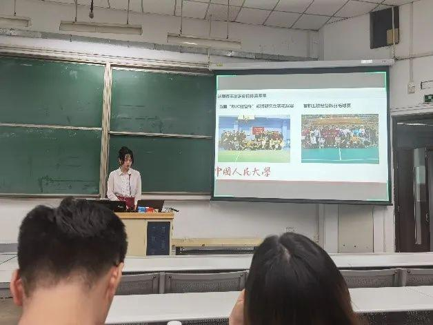 高艺菲同学首先介绍了文体部是院会组织和管理学生文化艺术体育活动的重要活动型部门,致力于打造学院精品文娱项目,丰富同学们的课余生活,提高大家的艺术修养和体育素质,其次重点介绍了文体部开展的体育活动,包括新生篮球赛、乒乓球赛、硕博羽毛球赛等赛事,并对新生们的加入表示期待。