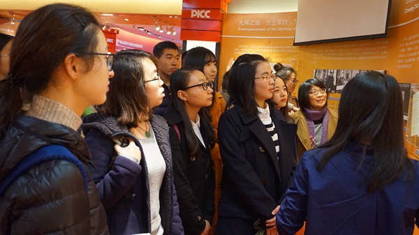 参观伊始,人保财险的张萌萌女士带领师生一行参观了色花堂展室。张女士为大家详细介绍了中国人保(集团)公司的企业历史、企业规模、团队管理方式、色花堂、社会公益情况及企业发展目标等内容。同学们仔细聆听,不时在自己关心的部分驻足观看。讲解结束后,色花堂 师生与人保财险公司的工作人员合影留念,公司还向到访的同学们赠送了精心准备的小礼品。
