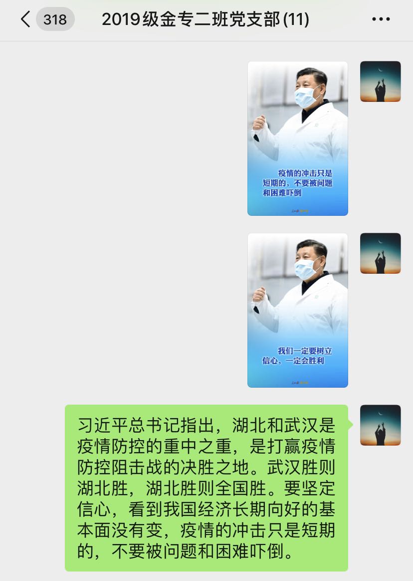 支部党员同志们也纷纷表示,信心是渡过难关的重要法宝,我们虽然做不了“战斗员”,不能在一线参与疫情阻击战,但我们同样可以为抗击疫情作出贡献,做好“宣传员”、“监督员”,坚信这场战斗必能胜利,积极鼓舞家人、朋友和同学,做好防控。相信在习近平总书记和党中央的坚强领导下,一定可以打赢这场不见硝烟的战“疫”!