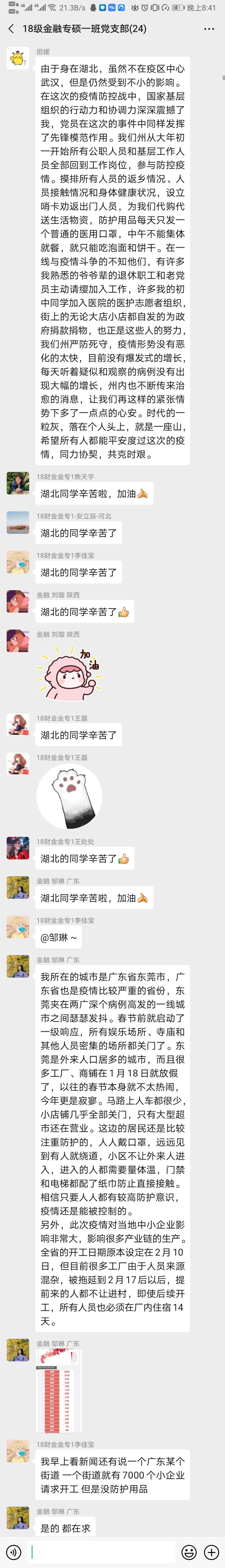 2月9日晚19时,2018级金融专硕一班党支部组织召开“抗击疫情,党员先行”线上主题党日活动。在疫情面前,支部党员们纷纷响应党中央“少聚集”的号召,在家中借助微信平台举办主题党日活动,全体支部成员均准时参加。