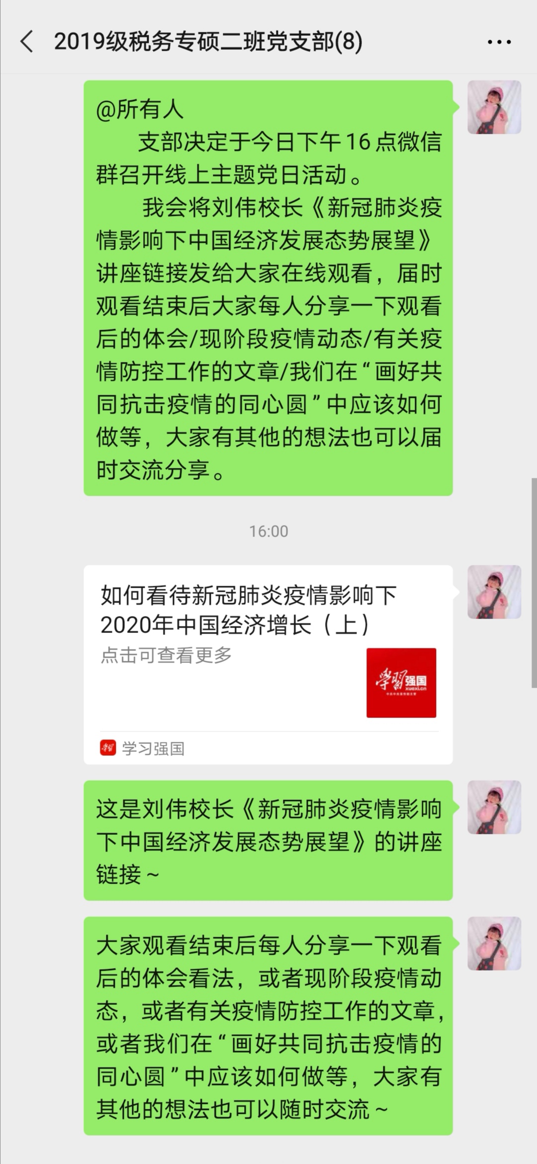 3月8日下午16点,2019级税务专硕二班党支部开展了“画好共同抗击疫情的同心圆”3月线上主题党日活动。此次活动由党支部书记马国焕同志主持召开,借助“微信群”、“学习强国”APP等新媒体手段组织开展。此次线上主题党日活动以“‘在经历中学习’系列疫情防控公开课”为载体,支部党员就抗击疫情、如何发挥党员的模范带头作用和支部的战斗堡垒作用等一系列有关问题积极展开讨论。