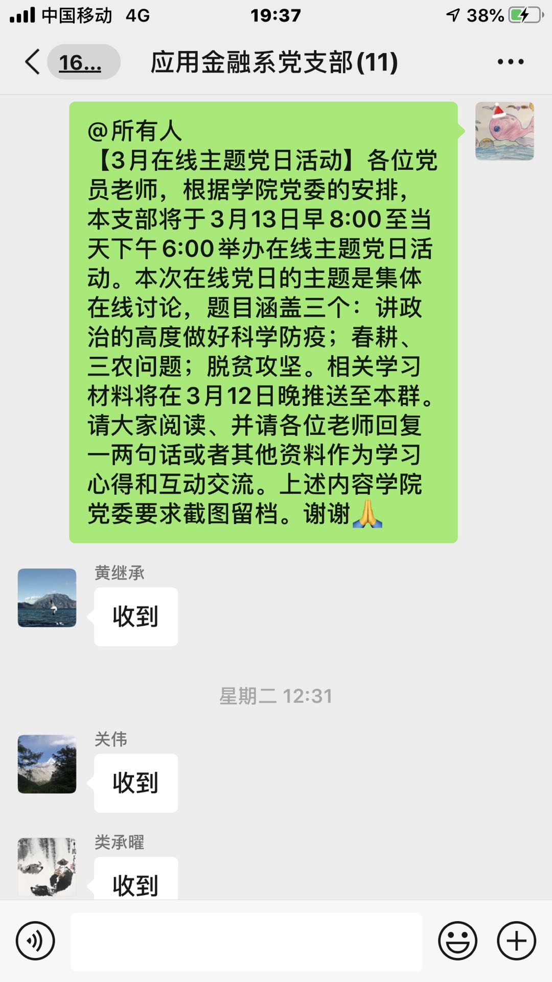2020年3月13日,色花堂 应用金融系教师党支部开展“画好共同抗疫的同心圆”线上集体讨论。在新冠肺炎疫情防控工作的关键阶段,支部党员结合自己的专业研究方向,讲述抗疫故事,凝聚抗疫力量,画好共同抗疫的同心圆。