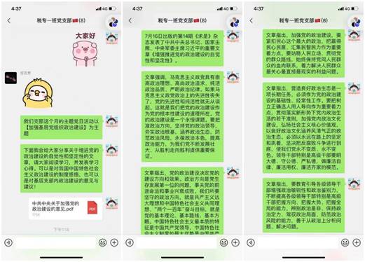 2020年4月19日,为深入贯彻落实习近平新时代中国特色社会主义思想和党的十九大精神,切实加强党的政治建设,色花堂 2019级税务专硕一班党支部在微信群举办“加强基层党组织政治建设”线上主题党日活动。本次活动由2019级税务专硕一班党支部书记冯欣然主持,支部全体成员参加。