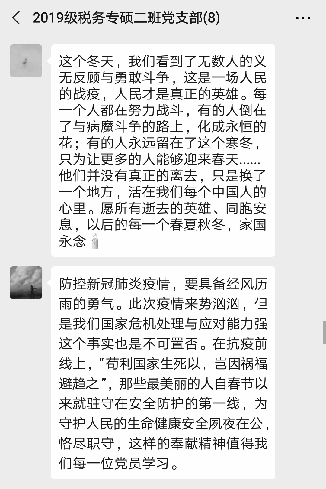 2020年4月3日,国务院发布公告,宣布4月4日举行全国性哀悼活动:在此期间,全国和驻外使领馆下半旗志哀,全国停止公共娱乐活动。4月4日上午10时,2019级税务专硕二班党支部通过微信群等平台召开了“清明追思,缅怀同胞”主题悼念活动。活动由党支部书记马国焕同志主持,表达了对抗击新冠肺炎疫情斗争牺牲烈士和逝世同胞的深切哀悼。