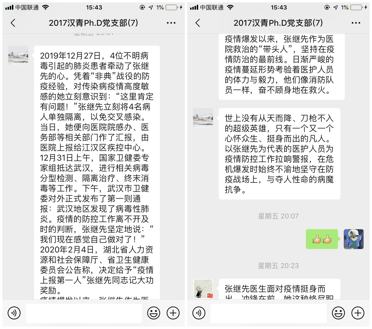 两位预备党员介绍完毕后支部党员纷纷发表意见,张楷伦同志表示,张继先医生坚持实事求是,救死扶伤的精神非常可贵,正是因为有这样一批恪尽职守、不畏艰险的医护人员在坚守岗位、坚持操守,才保障了疫情的控制,保障了人民群众的生命安全,我们应该学习他们的奉献精神,更好地服务人民大众。高婧同志表示,疫情刚开始,很多人没有意识到疫情的重要性,而在《新闻1+1连线》中,钟南山肯定了人传人现象,这为大众敲响了警钟。84岁的钟南山院士为祖国、为人民担起了肩上的责任,他好像是一枚定海针,与其他医务人员一起,为人民撑起了一片安全天空。我们应当学习他们勇为人先的精神,更好地服务人民大众。