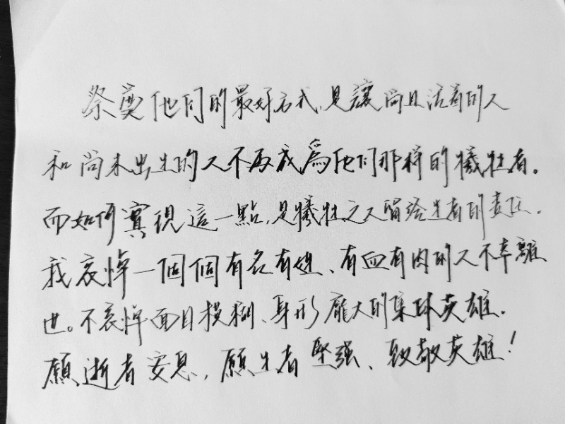 其他同志也纷纷以自己的方式表达感受,寄托哀思。王杨白雪同志将写给疫情中逝去英雄的一封信分享给支部成员,她表示,我们青年一代定将以他们为楷模,担当重任,铭记苦难,无畏前行。李越秋同志拍摄一张菊花的图片,以慰逝者。张修竹和刘怡君同志用笔写下对逝世同胞哀思和对中华民族的美好祝愿。