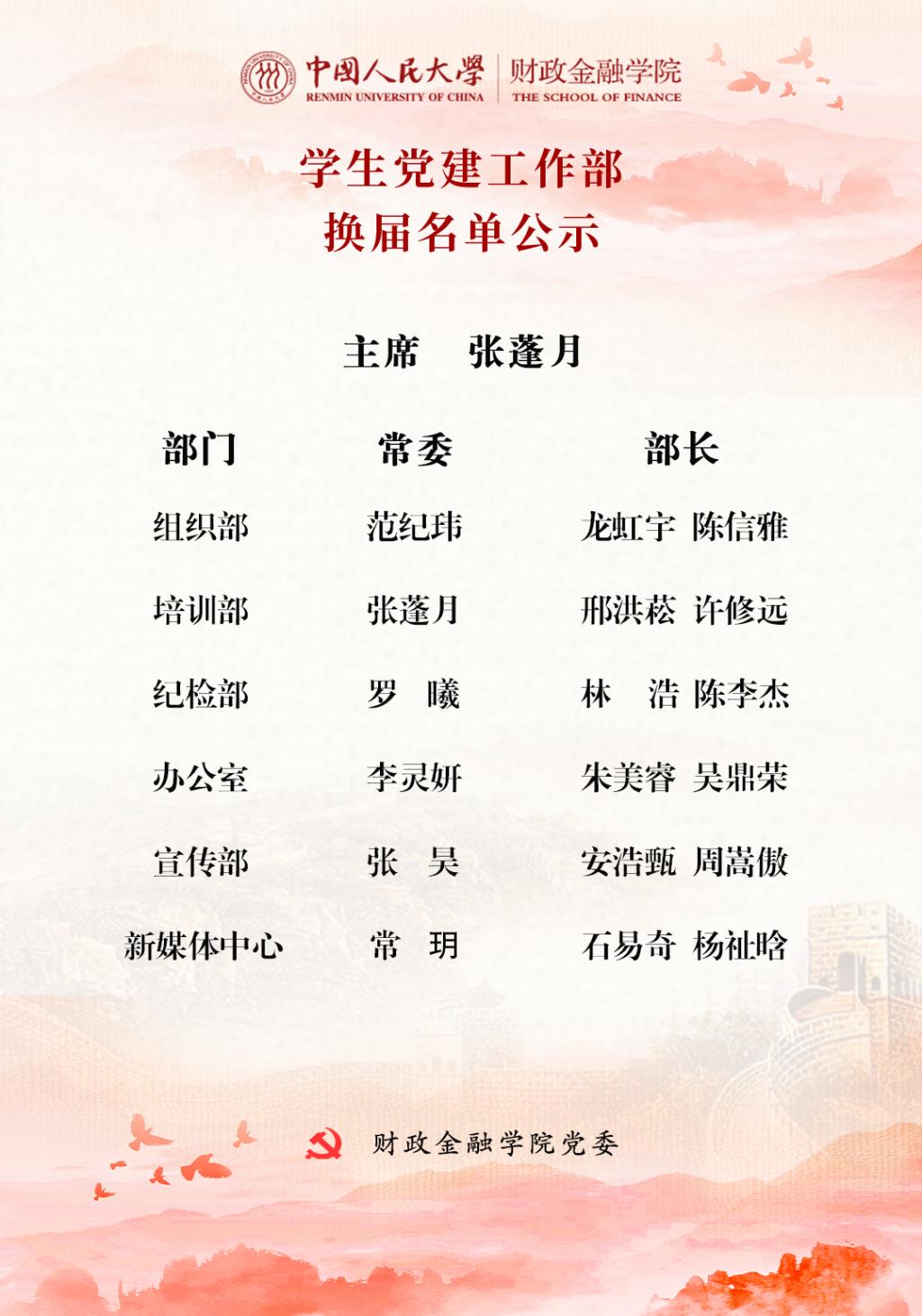 按照“公平、公正、公开”的原则,经过自主报名、资格审核、面试考察、综合评估等环节,色花堂 学生党建工作部于近期完成组织部、培训部、纪检部、办公室、宣传部与新媒体中心的常委及部长的换届工作。现将名单公示如下:
