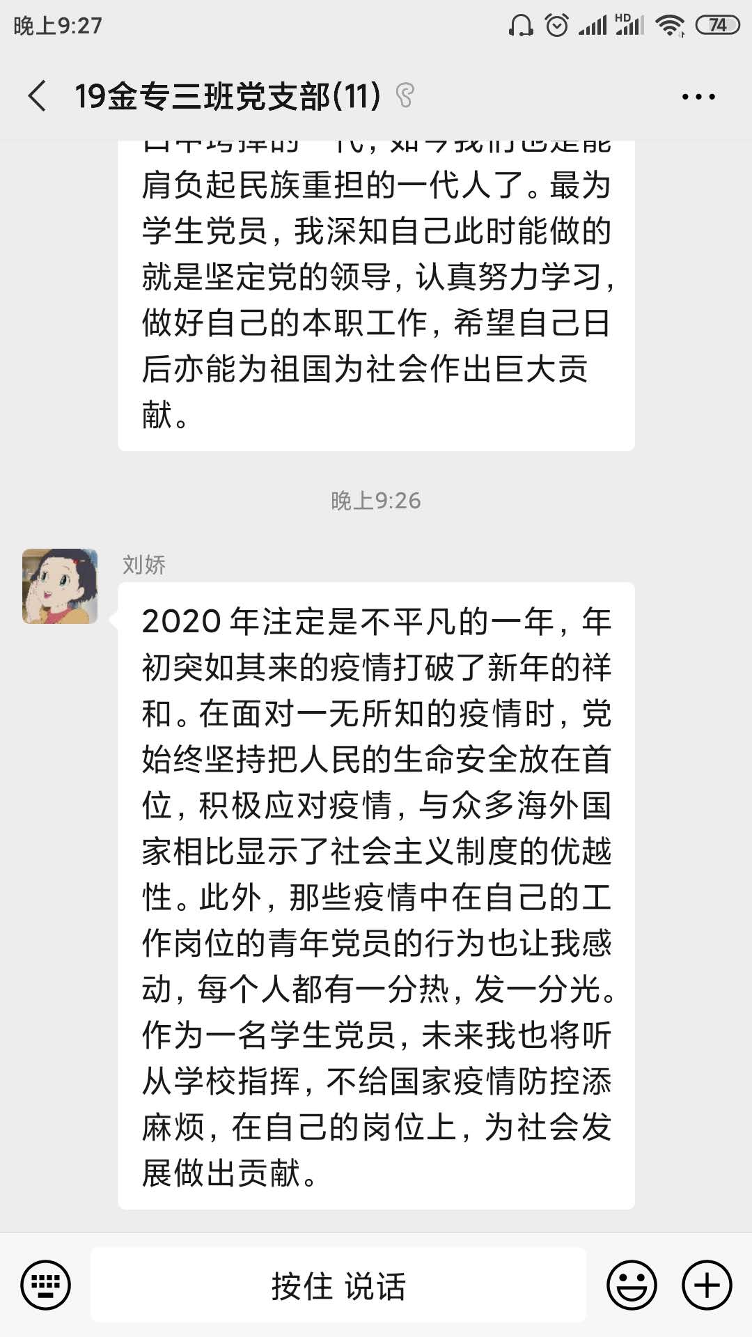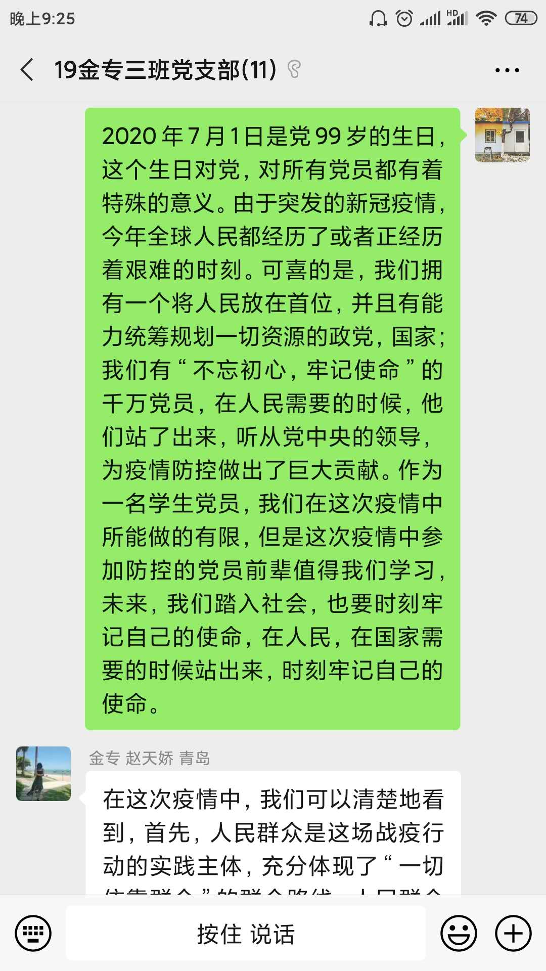 2020年7月1日是党的99岁生日,学院党委书记孙华玲老师为大家录制了以“党旗飘扬筑牢红色防火墙”为主题的微党课,本次主题党日活动将孙老师的微党课作为学习材料,支部各位成员先自行观看微党课,再集中讨论交流。晚上7点,支部成员准时上线,分享自己的学习心得。2020年年初,新冠肺炎疫情爆发,在这次疫情攻坚战中,党和国家时刻将人民放在第一位,以人民的生命安全为首要任务。同时,党中央坚持走群众路线的优势也在此时尽显,正是因为时刻谨记“为了人民”,才能在关键时刻“依靠人民”,在全国人民的努力下,抗疫战争取得了阶段性的胜利。在因为疫情无法返校的半年时间里,色花堂 学院通过各种方式保证所有师生正常的工作、学习,用线上活动的方式让党员同志能紧紧围绕在党组织身边。