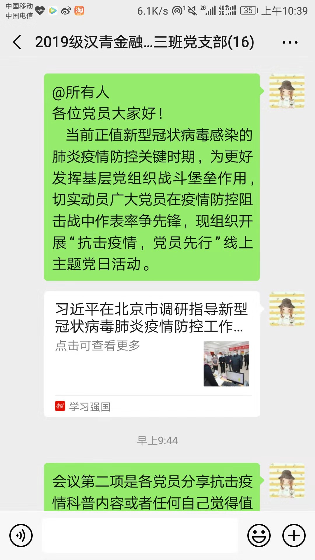 2020年2月12日晚,2019级汉青金融专硕三班党支部响应学院党委号召,在支部微信群组织开展了“抗击疫情,党员先行”线上主题党日活动。本次线上会议由陈嘉欣书记主持,全体党支部同志积极参与。