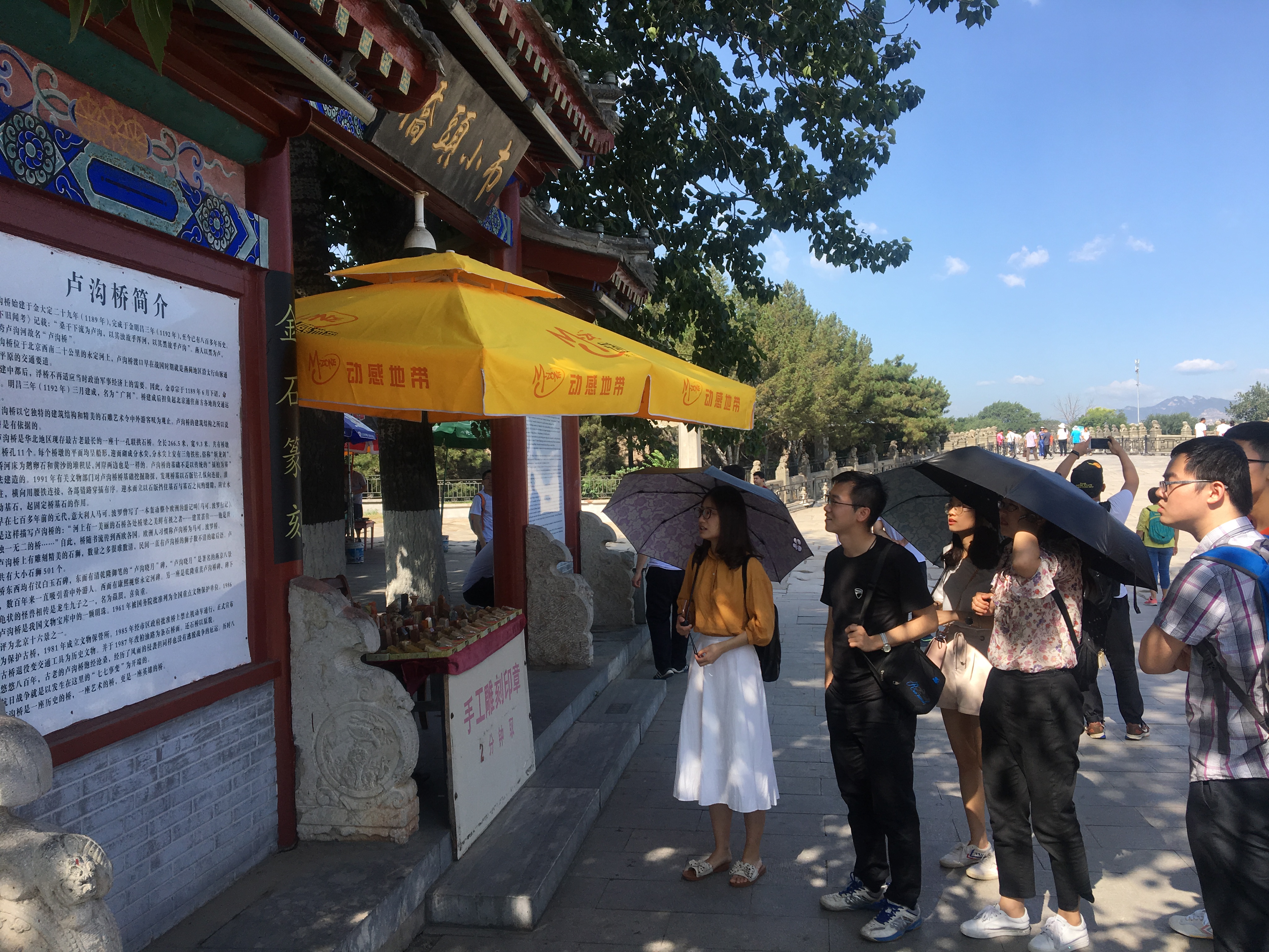 1933年7月7日,在卢沟桥发生的“七七事变”拉开了中国人民全面抗战的序幕。29日早8点,全体党支部成员便抵达了卢沟桥。初到桥头,同志们便被桥旁矗立的数尊石狮所吸引。这些石狮虽形态各异,但却无一例外地被斑驳交错的痕迹覆盖,仿佛在倾诉着中华民族不屈斗争的抗战血泪史。走过卢沟桥,在场者无不被其庄严肃穆的氛围所感染。