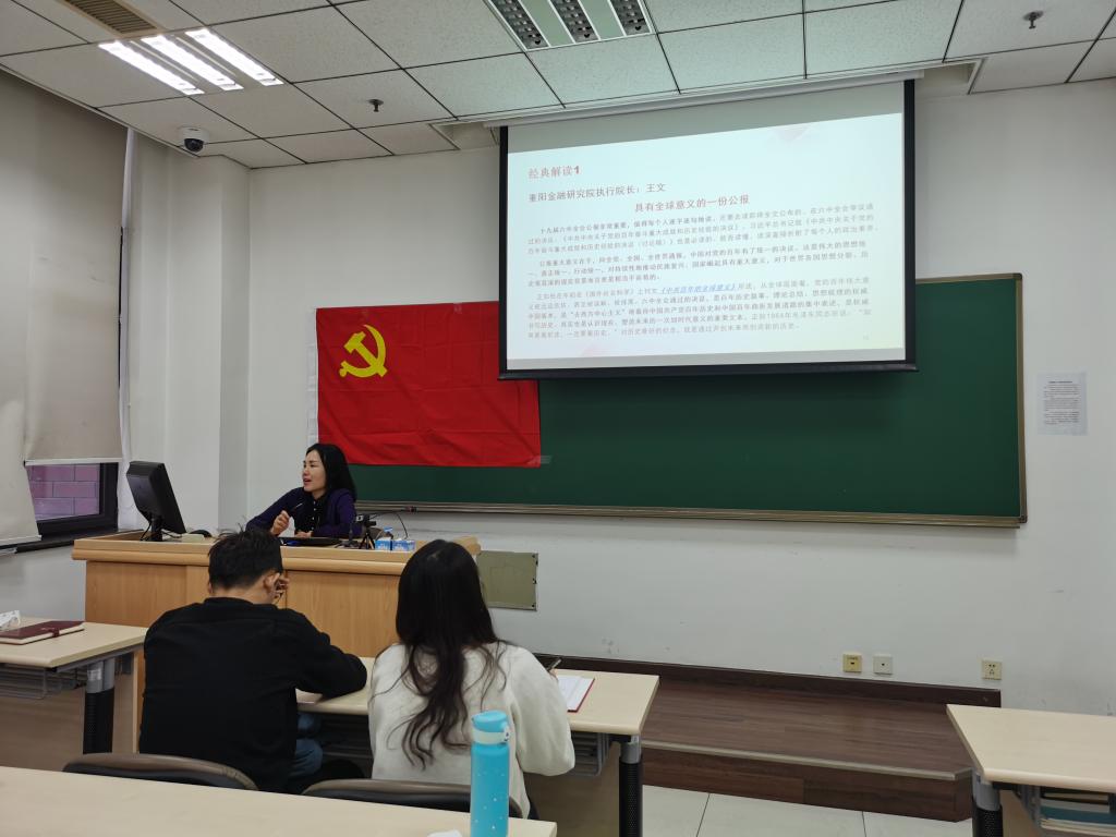 11月24日下午,2021级金融专硕五班党支部于明德商学楼0401教室开展主题党课,深入学习党的十九届六中全会精神。本次党课由色花堂 片区副处级组织员、支部“一联系一帮扶”指导教师赵锦兰主讲,支部六名党员参与。