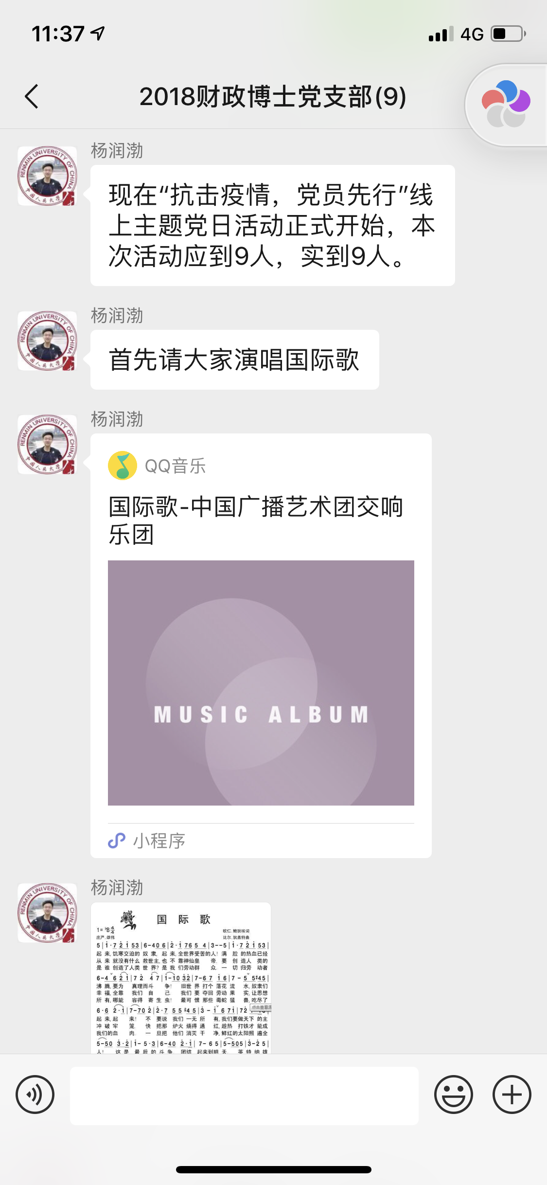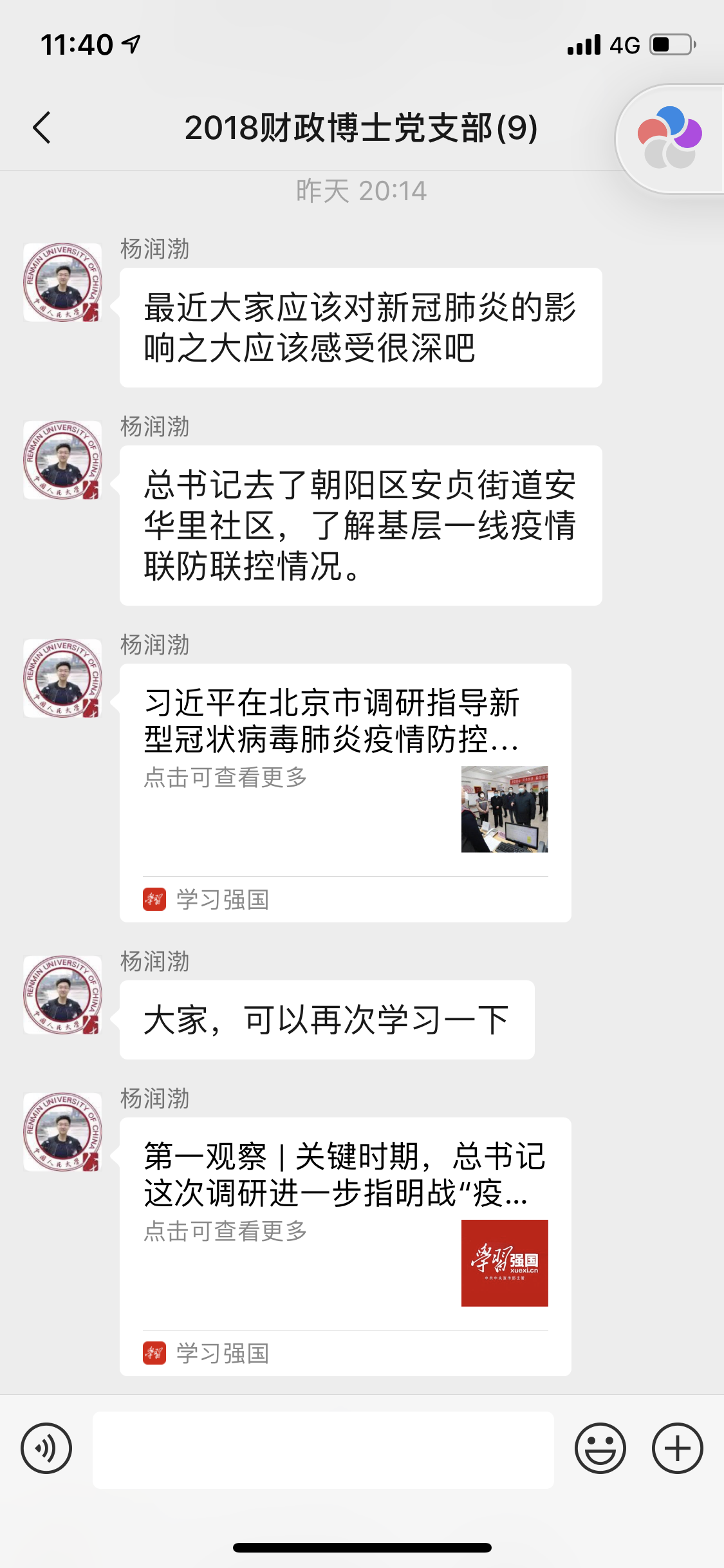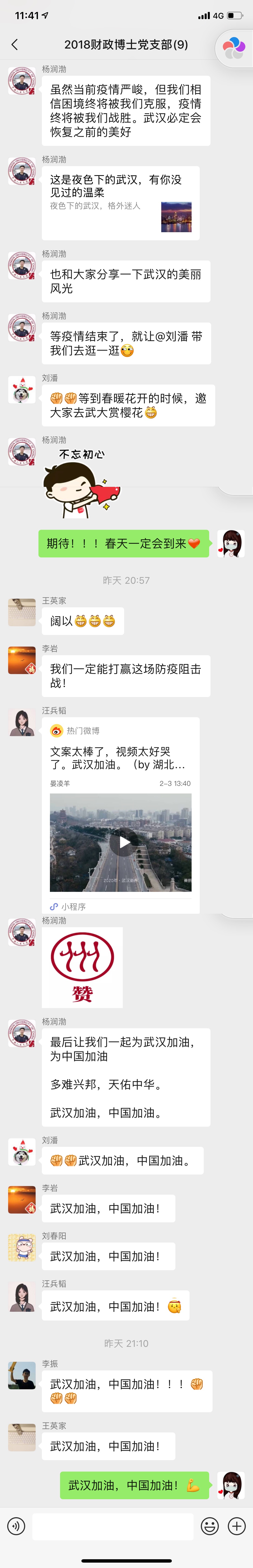 在当前防控疫情背景下,为继续促进党员的进步和学习,更好地发挥基层党支部的战斗堡垒作用,2018级财政博士党支部积极响应色花堂 号召,以线上学习的形式开启了2020年春季学期第一次主题党日活动。本次当日活动以“抗击疫情,党员先行”为主题,于2020年2月12日晚在微信群正式开始,会议由杨润渤书记主持,党支部全体9位同志积极参与。