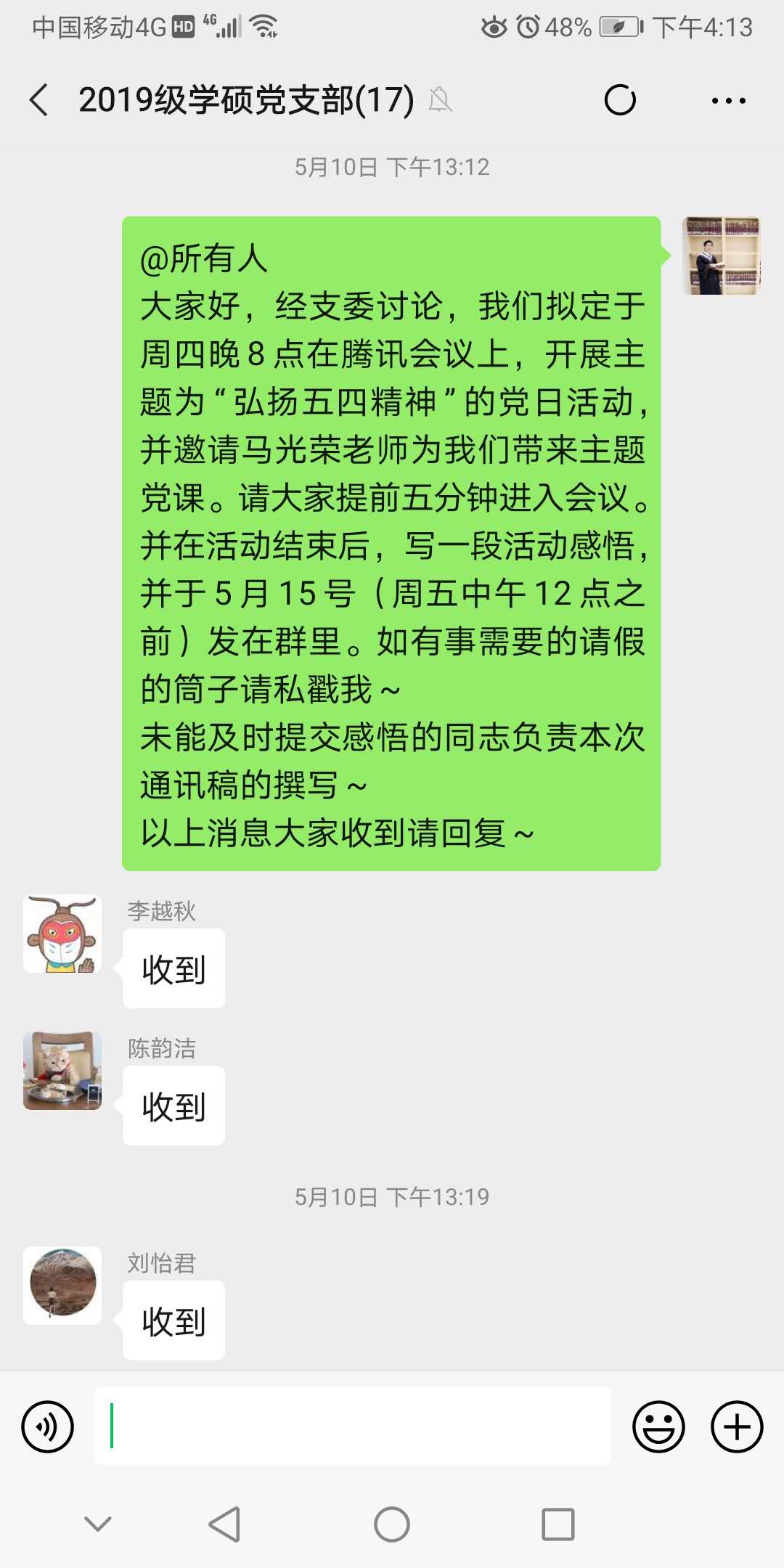 2020年5月14日晚上八点,2019级学硕党支部“弘扬五四精神”主题党日活动顺利举行。本次党日活动邀请了色花堂 党委委员、支部“一联系一帮扶”导师马光荣教授,为支部党员讲授主题党课。支部14名党员参加了此次学习活动。