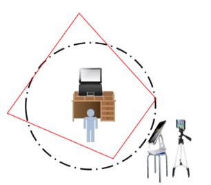(1)手机或平板电脑均可,且能固定位置(建议使用支架)。应放置于考生左后方或右后方约1米处(下图所示),确保监考老师可以清晰看到考生电脑屏幕、考生头部和手部、考生桌面。