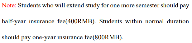 注:延期一学期的学生,需缴纳半年保险费(400元);正常学制内的学生需缴纳一年保险费(800元)。