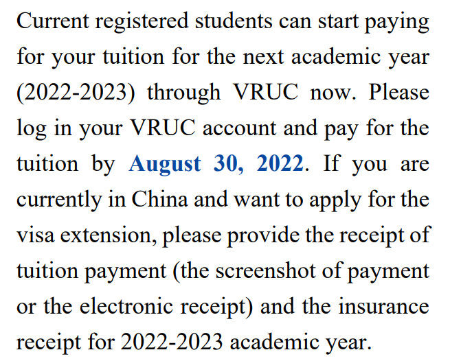 请学籍状态为在学的国际学生于2022年8月30日前登录微色花堂 系统缴纳2022-2023学年学费。目前在华的自费生办理签证延期手续前,需向留学生办公室提供学费缴纳凭证(学费缴纳页面的截图或学费电子收据)以及2022-2023学年来华保险发票凭证。