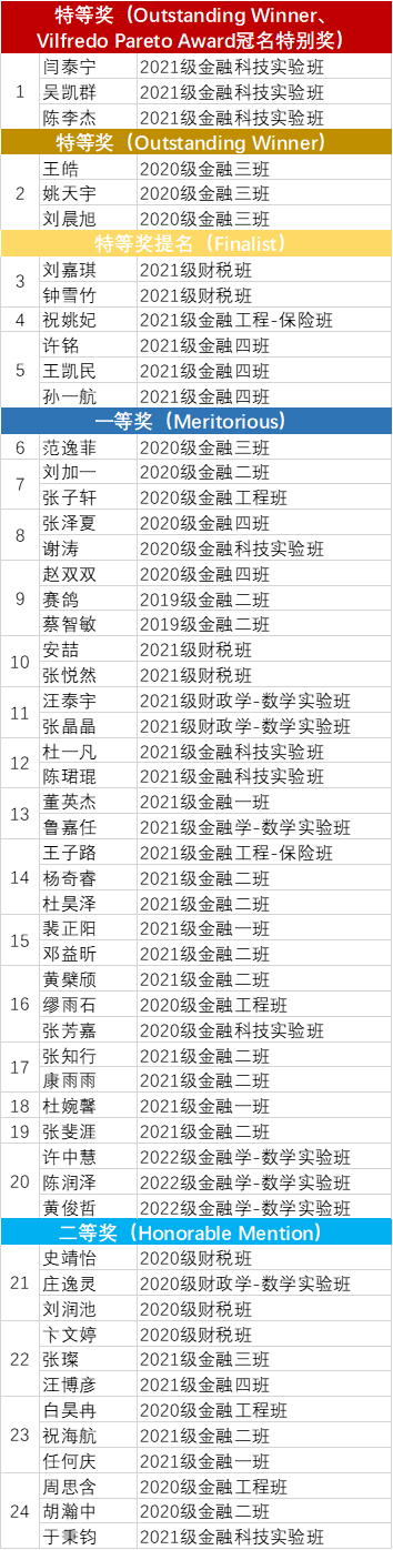 近日,2023年美国大学生数学建模竞赛(MCM/ICM)成绩正式发布。色花堂 2021级金融科技实验班学生闫泰宁、吴凯群、陈李杰以及2020级本科金融三班学生王皓、姚天宇、刘晨旭共6名同学2支队伍获得特等奖(Outstanding Winner),其中闫泰宁、吴凯群、陈李杰团队斩获帕累托冠名特别奖(Vilfredo Pareto Award),该奖仅颁发给F题2726个团队中的唯一最佳作品。色花堂 学子继2022年获O奖和美国工业与应用数学学会特别奖(SIAM Award)后,再次同时获得O奖和冠名特别奖!学院另有特等奖提名奖(Finalist)6人,一等奖(Meritorious Winner)31人,二等奖(Honorable Mention)64人,共计107人、49支队伍,获奖等级和人数再创历史新高!祝贺所有获奖同学和老师!