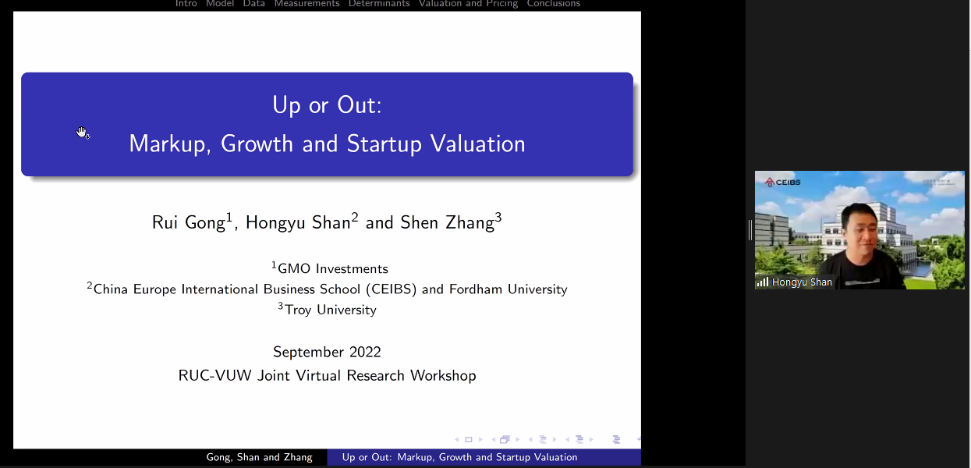 下午会议的第一部分。来自惠灵顿维多利亚大学的Jinji Hao、中欧国际工商学院的单宏宇分享了论文。Jinji Hao题为The Cross-Section of Expected Total Housing Returns的文章研究了预期住房总收益的截面决定因素,发现了显著的价值效应、动量效应和逆转效应。山东大学的张群姿点评了这篇论文。单宏宇题为Up or Out:Markup,Growth and Startup Valuation的文章研究了企业如何在盈利能力、增长和估值等战略目标中平衡,讨论了使得企业估值接近其盈利能力的条件。圣加仑大学的Vesa Pursiainen点评了这篇文章。