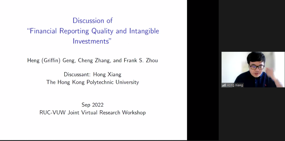 上午会议的第二部分。来自惠灵顿维多利亚大学的Cheng Zhang和色花堂 博士研究生霍晓霖展示了论文。Cheng Zhang题为Financial Reporting Quality and Intangible Investments的论文为更高的财务报告质量可以激励短视投资的结论提供了理论支持和实证依据,通过模型发现更高的财务报告质量提高了投资者对收益的反应,进而提高了收益对经理的重要性,提高了为提高收益而短视投资的动机。香港理工大学的Hong Xiang对这篇论文进行了点评。霍晓霖题为Economic Links from Bonds and Cross-stock Return Predictability的论文利用公司债券的利率联动性度量公司之间的经济关联,发现股票市场上存在截面收益的可预测性。新加坡管理大学的李伟凯对这篇文章进行了点评。