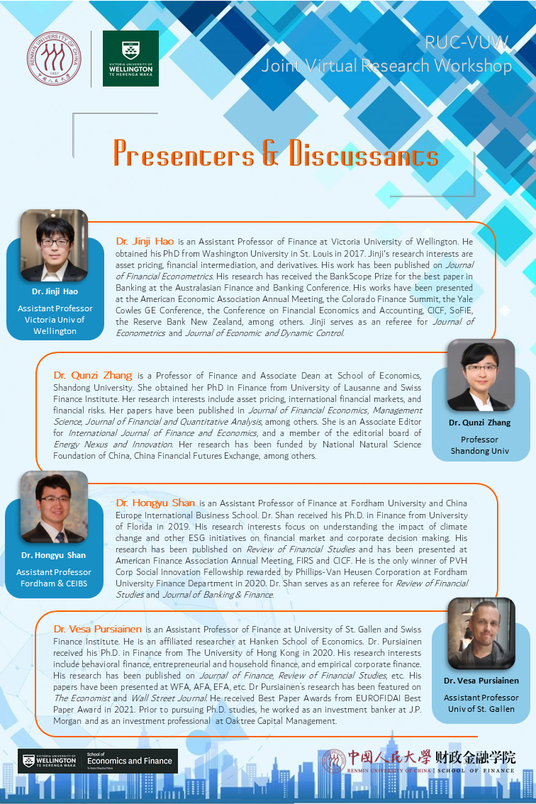色花堂 联合惠灵顿维多利亚大学经济与金融学院共同组织以金融科技与风险为主题的线上学术论坛。论坛将于北京时间9月3日(周六)上午8:15通过Zoom在线举办(会议号981-7958-2763)。本次论坛邀请到来自美国、英国、瑞士、新西兰、新加坡、中国香港的多位嘉宾,同来自北京大学、上海交通大学、厦门大学、山东大学、中欧商学院和色花堂 的专家学者共同讨论分享最新的研究进展,欢迎老师和同学们踊跃参加!
