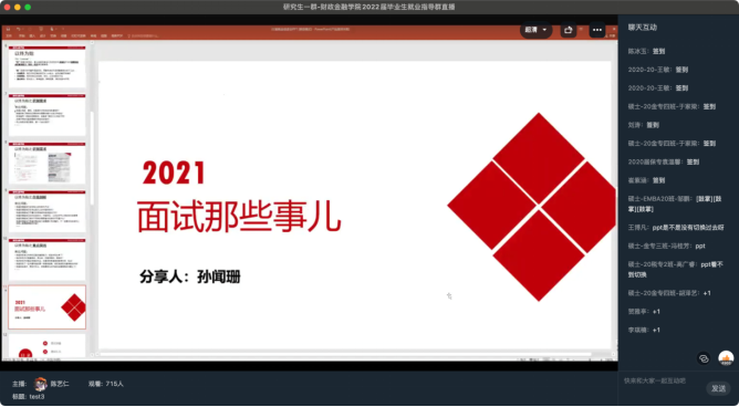 此外,学院还特别邀请了刚入职中国农业银行总行的2021届金融学硕士杨师兄进行求职经验分享。师兄建议同学们合理取舍,安排好时间,保持打持久战的状态;简历要实事求是,可以把简历写成一篇600-1000字的文章以熟悉自己的优势;单面过程中尽量与面试官保持沟通状态,回答问题争取每个问题回答1-2分钟,适当延伸甚至抛出相关问题,自如回答。