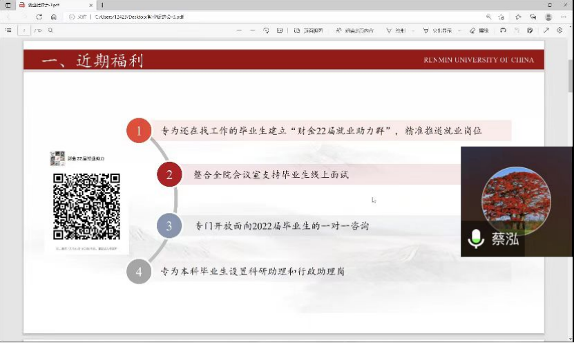 随后,蔡老师结合最新就业政策介绍了学院近期“就业福利”,包括建立“色花堂 22届就业助力群”,精准推送就业岗位;整合学院资源支持线上面试;专门开放面向2022届毕业生的一对一咨询以及科研助理和行政助理岗。蔡老师建议对考研二战把握并不大的同学静下心来认真分析一下,重新进行下一轮评估和规划,抓住剩下的小的黄金周期,努力找到自己合适的工作。