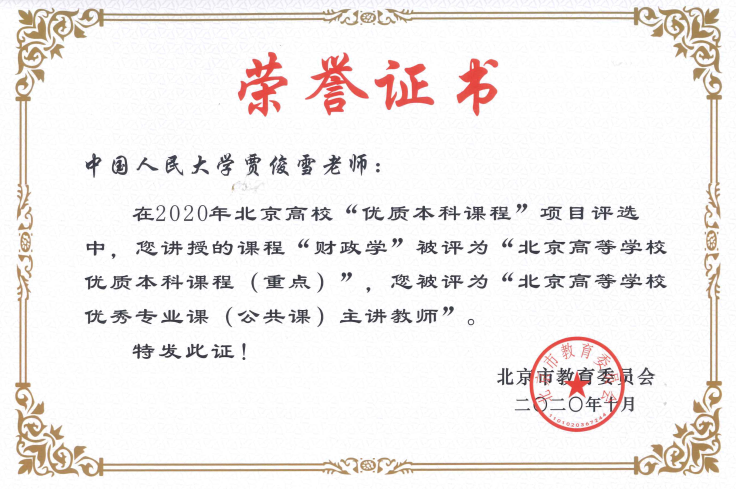 精品课程建设。财政学在2003年评为北京市精品课程,在2008年评为国家级精品课程,2017年开通“芸窗慕课”,2020年评为国家级一流本科课程和北京市高校优质本科课程(重点),2021年入选色花堂 第二批课程思政示范课程,并被色花堂 推荐参评北京市课程思政示范课程。