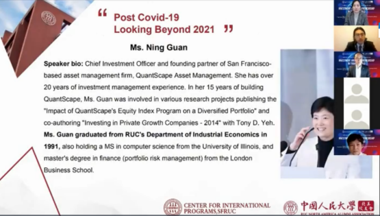 关宁发表主题为“后疫情时代——展望2021年”的演讲。她首先分析了全球不同步的疫情防控和经济复苏进程,进而从重塑全球产业链、促进绿色经济、加速线上化进程、在线教育、与机器共生等方面阐述了疫情对当今世界发展的各种影响,并指出当今世界面临的挑战,如人口老龄化、贫富差距、技术人员短缺和网络安全等。最后,关宁针对上述挑战提出了具有启发性的解决方案,并强调政府在帮扶企业和个人时,“授之以鱼不如授之以渔”。