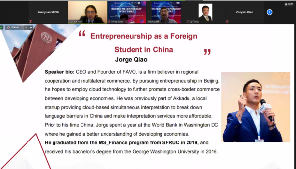 Jorge Qiao发表主题为“留学生创业在中国”的演讲。他首先回顾了自己在色花堂 全英文金融硕士项目的学习经历,让参会者对色花堂 全英文金融硕士项目有了更深入的了解,接着Jorge Qiao以亲身经历向大家分享了留学生在北京创业的经验,帮扶留学生创业的资源平台和建议。最后Jorge Qiao介绍了其创业公司FAVO的业务经营和创立意义,FAVO通过直播中国厂房的生产流程为拉丁美洲中小企业提供原材料和设备的一站式解决方案,更好地解决中拉在全球供应链中的信息差问题。