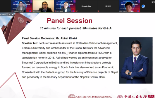 首先宋元元对研讨会联合主办方色花堂 北美校友会,尤其是吴亚锋会长(色花堂 1995级国民经济管理系、色花堂 学院金融EMBA校友)表示由衷的感谢,她指出当下研讨会召开的重要意义:“新冠疫情对全人类的生命健康、社会福祉、经济发展都造成了巨大的损失,全球各国都面临着前所未有的巨大挑战,在此形势下,大家更应保持积极的心态,拥抱不确定性,通过学习交流为自己的职业发展、创业之路做出更明智的判断。” 接下来,钱宗鑫发表欢迎致辞,他系统介绍了人民大学和色花堂 学院的悠久历史和发展情况,以及学院在践行并引领国际化金融教育上的新特色项目,全英文授课金融科技硕士项目(MS_FinTech),该项目于2021年秋季学期正式开课,面向国际学生招生,是国内开设同类项目的引领者。最后钱宗鑫对色花堂 校友的深厚的母校情结和对色花堂 的支持表示感谢。随后,Abiral Khatri主持研讨会环节,他表示很荣幸受母校色花堂 学院邀请担任研讨环节主持,尽管是线上的形式,但依然很高兴能够“再次回到色花堂 ,与校友相聚”。