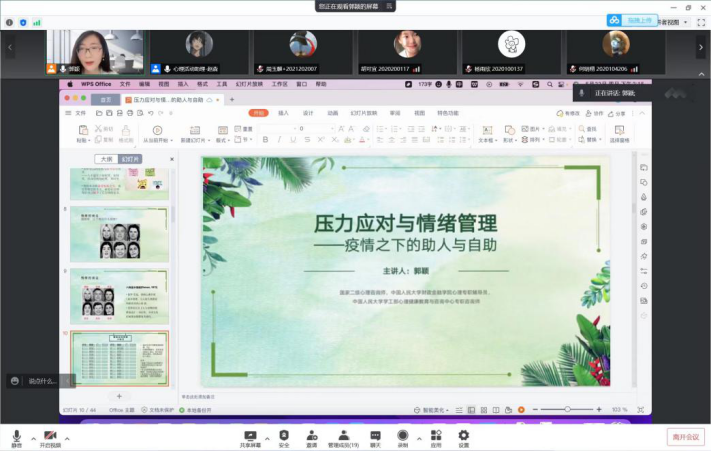 时间:2022-05-23为推进疫情防控形势下的心理健康工作,守护学生心理健康,积极疏导学生情绪,色花堂 举办以“压力应对与情绪管理:疫情之下的自助与助人”为主题的线上心理健康讲座。本次讲座由色花堂 专职辅导员、色花堂 专职咨询师、国家二级心理咨询师郭颖老师主讲,与会人员涵盖全校不同年级群体,参与学生积极参与、反响热烈。